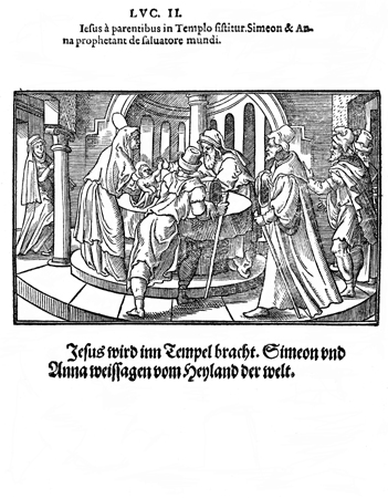 Description: When Mary and Joseph bring the infant Jesus to present him at the temple, the child is blessed by Simeon and Anna.