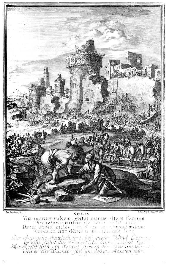 Description: The people rebuild the wall of Jerusalem with a tool in one hand and a sword in the other.
