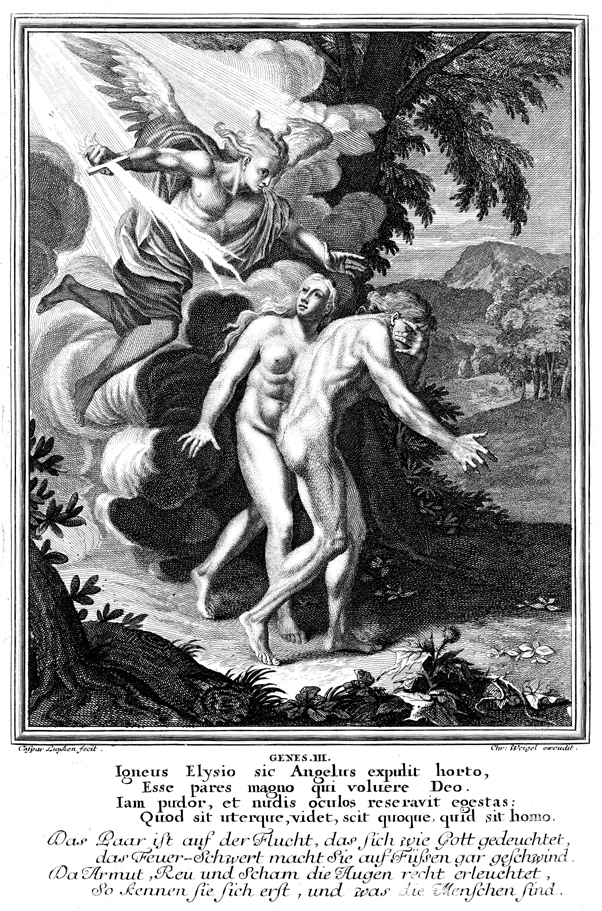 Description: An angel expels Adam and Eve from the Garden of Eden after they have eaten the forbidden fruit. The names of the engraver or artist, Caspar Luyken (1672-1708), and the printer, Christoph Weigel (1654-1725), are located below the woodcut in the bottom left and right corners respectively.