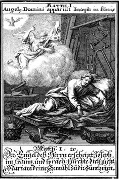 Description: An angel appears to Joseph in a dream telling him not to be afraid to take Mary as his wife because the child within her is of the Holy Spirit. The Holy Spirit is depicted in the form of a dove. Tools are all over Joseph's room signifying he is a carpenter.