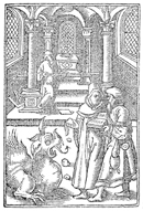 Description: In the background John measures the temple and the altar as instructed, while in the foreground two powerful witnesses prophesy. The beast from the bottomless pit waits for them to finish their testimony, so that he may kill them.