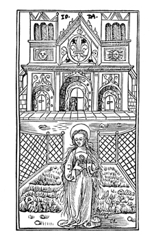 Description: The Virgin Mary stands in a garden with a church building in the background.