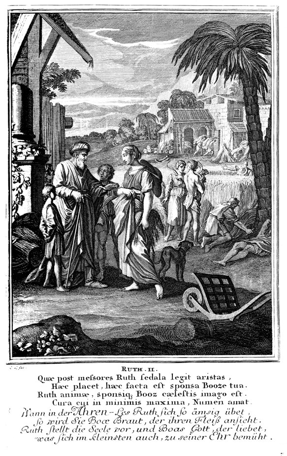 Description: Boaz meets Ruth as she gleans from his field.