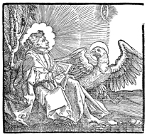 Description: Receiving inspiration from Jesus Christ, John writes his gospel with his attribute, the eagle, nearby.