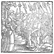 Description: Before a crowd of armed men and a couple of distraught defendants, a witness offers a false testimony, illustrating a violation of the ninth commandment.