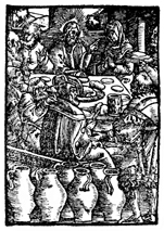 Description: At the direction of Mary, Jesus performs his first miracle, changing water into wine at a wedding feast in Cana.