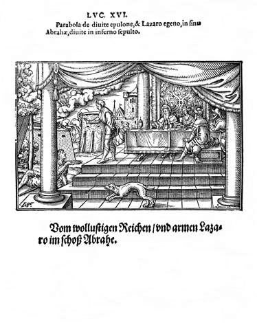Description: Lazarus sits at the gate of the rich man, who lives in luxury. In the rear, the rich man begs Abraham to allow Lazarus to put water on his tongue to quench his torment. The artist, Virgil Solis (1514-1562), has placed his monogram in the lower left corner of the woodcut. In addition there is the engraver’s knife, a plus sign (+), and the numeral 10 in the lower right corner.