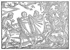 Description: Ham dishonors Noah by pointing out his nakedness, but Shem and Japheth cover their father with a sheet.