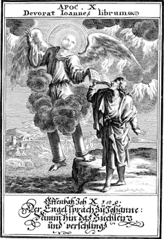 Description: An angel instructs John to eat the little scroll.