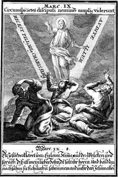 Description: Jesus is transfigured before Peter, James, and John. The text is the Latin version of God's proclamation to Peter, James, and John, "This is My beloved Son; listen to Him" (RSV).