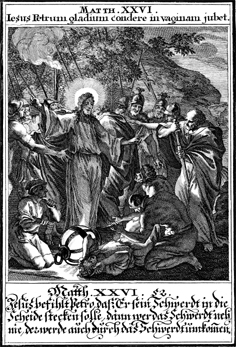 Description: Jesus commands Peter to put his sword back in its sheath as he is arrested.