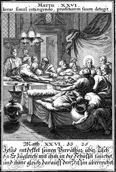 Description: Judas and Jesus dip their hands into the bowl at the same time, signaling his role as the traitor.