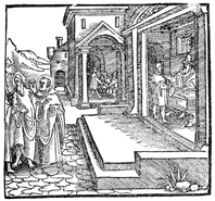 Description: The rich man fires the dishonest steward and demands a report on his accounts. In the rear, the dishonest steward adjusts his accounts.