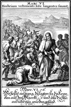 Description: People bring the sick and demon possessed to Jesus in Gennesaret, begging him to allow them to touch even the hem of his garment.