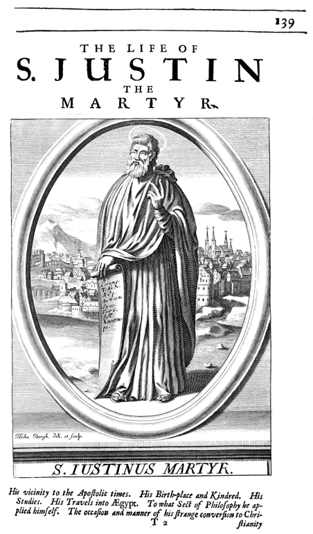 Description: Shows St. Justin Martyr holding a Greek scroll. This engraving is the work of Michael Burghers.