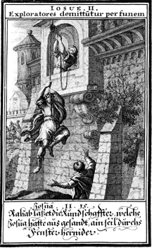 Description: Rahab lowers the spies through the window of her house in Jericho.