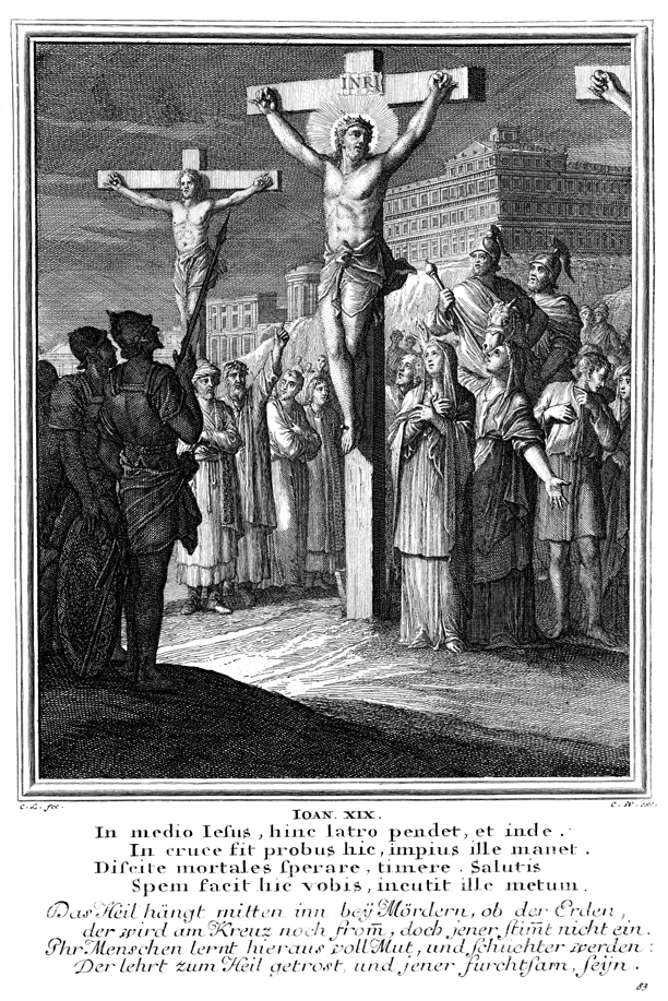 Description: Jesus is crucified on the cross between two criminals while the crowd looks on.