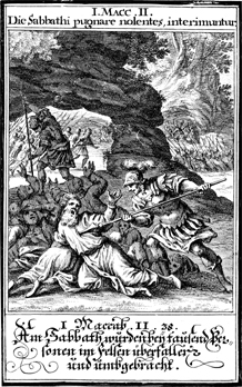 Description: Those who refused to worship as Antiochus IV Epiphanes are killed in the desert on the Sabbath due to their failure to resist on a holy day.