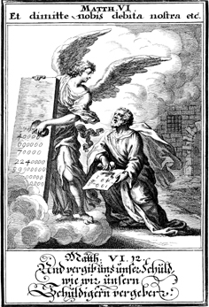Description: An angel forgives a man's debts as a rendering of the petition "Forgive us our debts" from the Lord's Prayer.