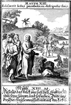 Description: Jesus tells the Parable of the Weeds as the action takes place in the background.