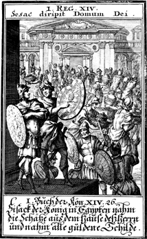 Description: Shishak, Pharaoh of Egypt, plunders the Temple of Jerusalem during the reign of Rehoboam.