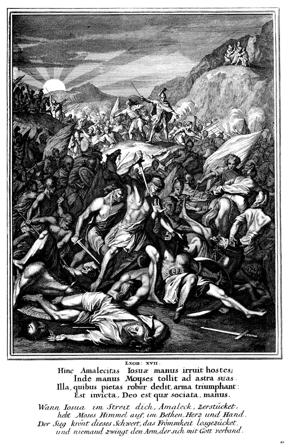 Description: Aaron and Hur hold up Moses' hands enabling Joshua to defeat the Amalakites.
