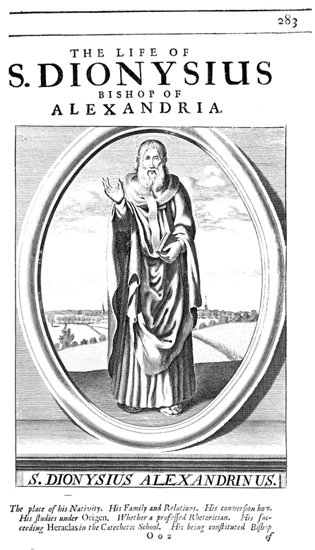 Description: St. Dionysius, Bishop of Alexandria, is shown here in the same style as the other figures in the volume by Cave, but this engraving is unsigned by artist Michael Burghers.