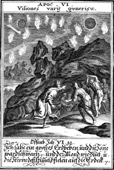 Description: Upon the opening of the sixth seal, there was a great earthquake, the sun turned black, the moon turned to blood, and the stars fell from the heavens.