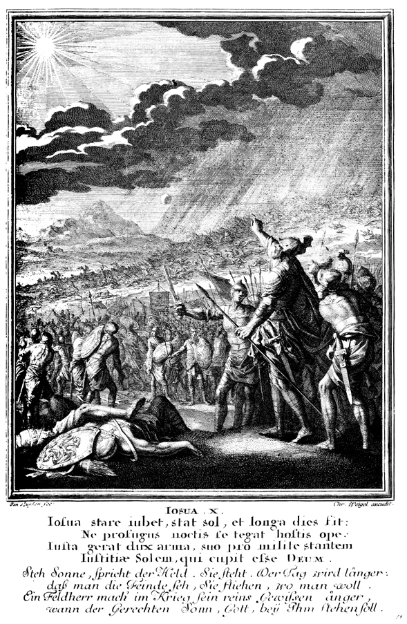Description: Israel defeats the Amorites at Gibeon with the help of God, who rains down stones upon the Amorites and causes the sun and the moon to stand still.