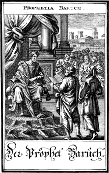 Description: The prophet Baruch reads the words of his prophecy to King Jeconiah of Judah.