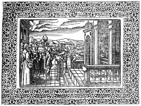 Description: Samuel anoints David king of Israel in the presence of his father and brothers. His attribute, the harp is before him on the ground. The monogram of the artist, Virgil Solis (1514-1562), has been placed in the lower left corner of the woodcut.