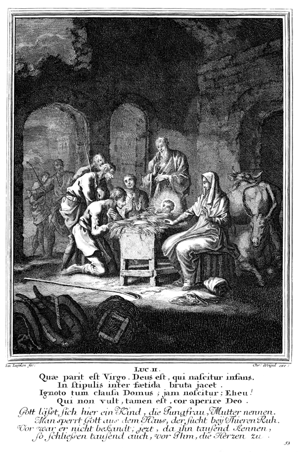 Description: Shepherds visit the newborn Jesus after learning of his birth from an angel.