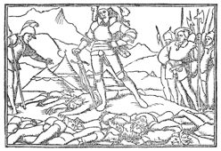 Description: Joshua and his soldiers stand over a group of dead kings, symbolizing their victory over the Canaanites.