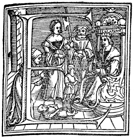 Description: An initial letter E with Solomon demonstrating his wisdom by ruling between two prostitutes, both claiming custody of an infant.
