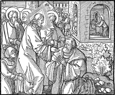 Description: As Jesus hears a ruler's petition for him to bring his daughter back to life, a woman touches Jesus' garment and is healed of her bleeding. In the background, Jesus raises Jairus' daughter from the dead. The engraver's knife and monogram (CE) are placed to the upper left corner, and the 4-cross is in the lower right corner.