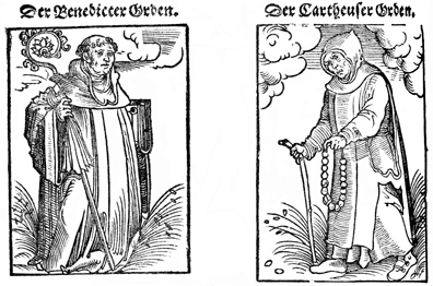 Description: Renderings of the Benedictine and Cartheusian orders. This woodcut was created by Lukas Cranach the Elder.