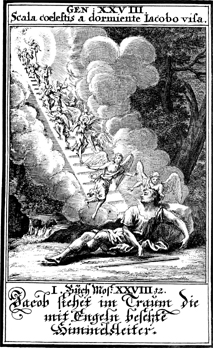 Description: Jacob receives God’s blessing during a dream in which angels are ascending and descending a ladder connecting heaven and earth.