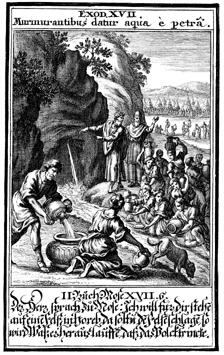 Description: Moses brings water from the rock at Maribah by following God’s command to strike the rock with the stick he used at Marah.
