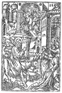 Description: Jesus rides into Jerusalem on a donkey to the waving of palm branches (front) and cleanses the temple (rear).