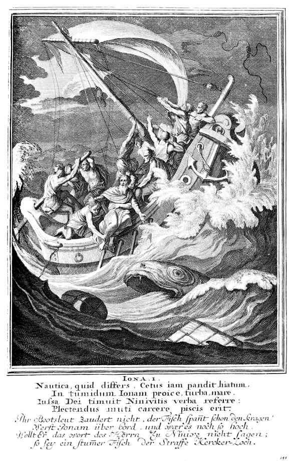 Description: Sailors throw Jonah overboard, and he is swallowed by a large fish.