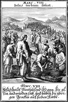 Description: Jesus feeds the 4,000 with seven loaves of bread and a few small fish. Afterwards, seven baskets of leftovers are collected.