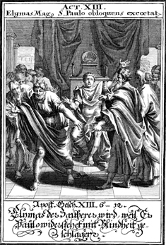 Description: Barnabas and Paul are brought before the proconsul Sergius Paulus in Paphos where they are challenged by the sorcerer Elymas (Bar-Jesus). Elymas/Bar-Jesus is struck blind during the encounter.