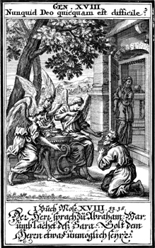 Description: Abraham kneels before the angels at Mamre, and Sarah stands in the doorway listening, as the as the angels inform Abraham of God’s plan to bless him with a son through Sarah.