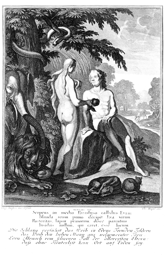 Description: Eve shares a piece of forbidden fruit with her husband Adam, as the nearby serpent closely watches. The names of the engraver or artist, Caspar Luyken (1672-1708), and the printer, Christoph Weigel (1654-1725), are located below the woodcut in the bottom left and right corners respectively.