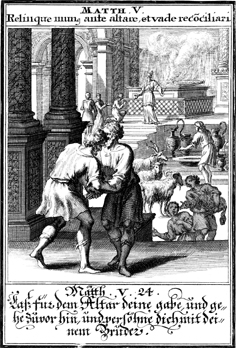 Description: As two are reconciled, a priest offers a sacrifice reconciling the people to God. This illustrates the command to go be reconciled with one another before bringing one's gift to God.
