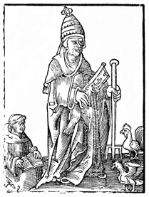 Description: The Pope holds a bird that he killed with a pitchfork.