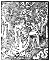 Description: God the Father holds the dead body of Jesus Christ. The Holy Spirit is depicted in the form of a dove above.
