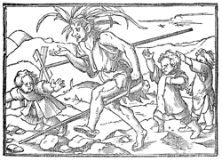 Description: A fool is pictured with a feather hat, about to trip himself with a cane; one shoe on and one off; and three children running about him.