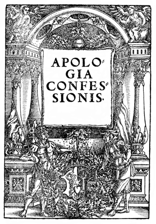 Description: Historiated title-page border by the student of Lemberger, "Master of Jacob's Ladder." It features the resurrection lamb (upper left) and the crest of Philipp Melanchthon (upper right) and an emblematical crest at the lower center.