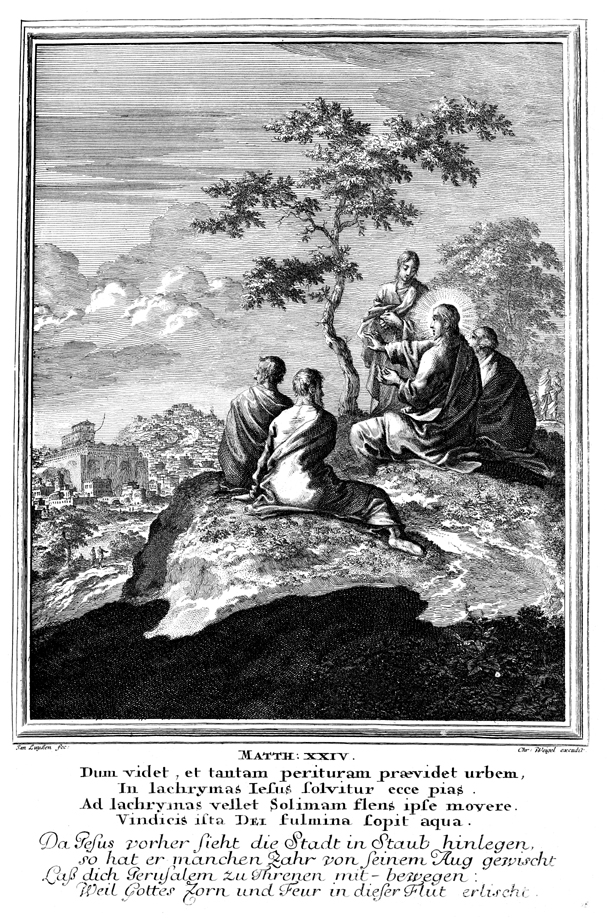 Description: Sitting under a tree on a hill overlooking Jerusalem, Jesus tells his disciples of the impending destruction of the city.